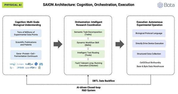 Melalui Bahasa Protokol Biologi proprietari Bota, SAION AI menukar reka bentuk eksperimen kepada arahan piawai yang secara langsung mengawal perkakasan makmal, sambil menyalurkan semula data dunia sebenar ke Lapisan Kognisi bagi membolehkan penambahbaikan model berterusan dan mempercepatkan R&D.