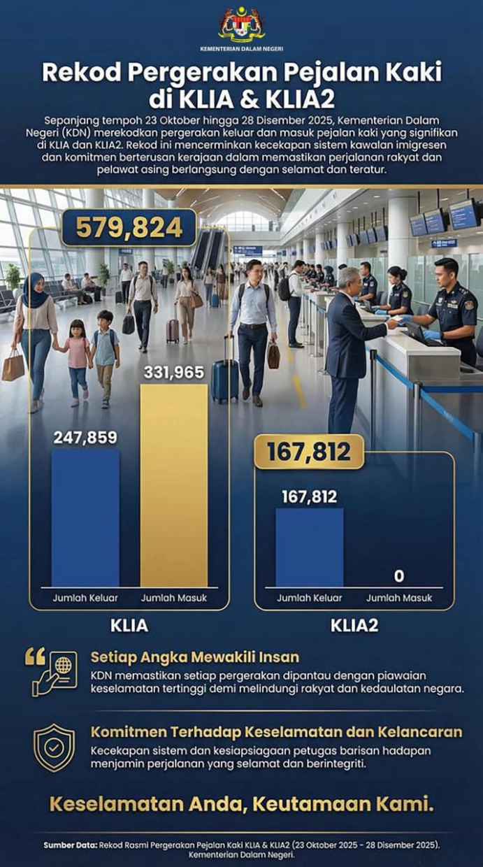 Kuala Lumpur, 31 Disember 2025* – Kementerian Dalam Negeri (KDN) hari ini mengumumkan rekod pergerakan pejalan kaki keluar dan masuk di Lapangan Terbang Antarabangsa Kuala Lumpur (KLIA dan KLIA2) bagi tempoh dari 23 Oktober hingga 28 Disember 2025, dengan jumlah keseluruhan mencapai 579,824 pergerakan.