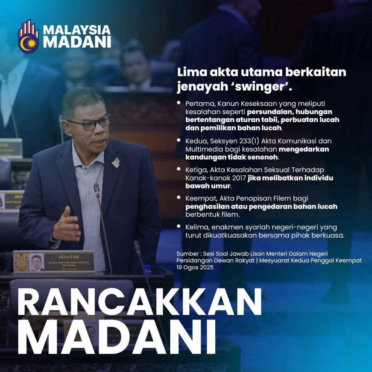 KUALA LUMPUR, 19 Ogos 2025 – Menteri Dalam Negeri, Datuk Seri Saifuddin Nasution, menegaskan kerajaan memandang serius jenayah “swinger” dalam talian yang melibatkan penjawat awam dan pelajar universiti, sambil menegaskan kewujudan peruntukan undang-undang sedia ada untuk membanteras jenayah seksual dalam talian.
