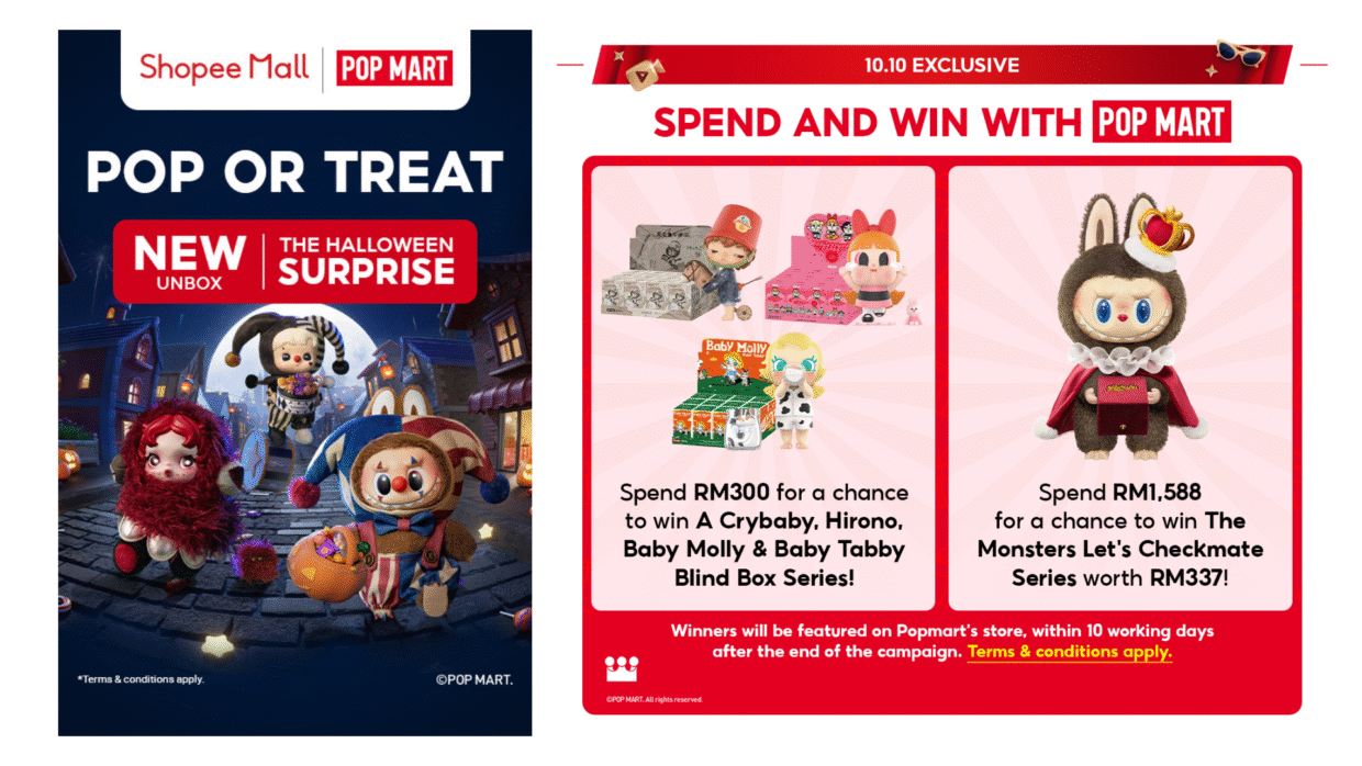 KUALA LUMPUR, MALAYSIA – Media OutReach Newswire – 10 Oktober 2025 – Shopee Malaysia dan POP MART menambahkan keterujaan sempena Shopee 10.10 Festival Jenama dengan pelancaran khas Siri Halloween POP MART yang bertema seram serta restok mengejut bagi pelbagai koleksi popular. Peminat yang berbelanja di Kedai Rasmi POP MART di Shopee Mall juga boleh menebus hadiah eksklusif Spend & Win, termasuk koleksi ikonik ‘LABUBU FALL IN WILD’ dan ‘Let’s Checkmate’ Vinyl Plush Dolls daripada siri ‘THE MONSTERS’, hanya pada 10 Oktober.